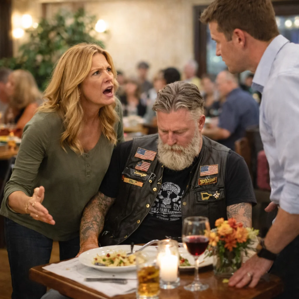 “The vest. The patches. Some families are uncomfortable. We have a dress code, so I’d appreciate it if you could remove it… or possibly dine somewhere more appropriate.”